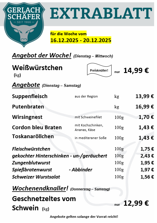 Wir stellen fast alle unsere Produkte in unserer eigenen Fabrikation her. Hierbei verwenden wir ausschließlich Fleisch aus der heimischen Region - das sieht man und vor allem schmeckt man es. Viele denken, Wurst- und Fleischwaren beim heimischen Metzger wären deutlich teurer als abgepackte Ware im Supermarkt. Dass dies ein Vorurteil ist, können Sie in unserem wöchentlich erscheinenden EXTRABLATT sehen, in dem wir Sie über die aktuellen Angebote, aber auch über unsere Normalpreise immer aktuell informieren.